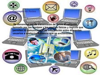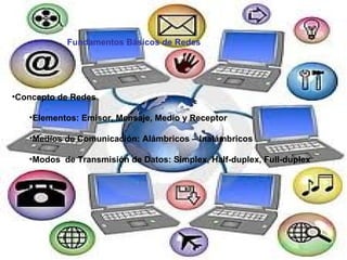 Este documento describe los fundamentos básicos de las redes, incluyendo los elementos clave de un emisor, mensaje, medio y receptor. Explica los diferentes tipos de medios de comunicación, como alámbricos e inalámbricos, y los modos de transmisión de datos, como simplex, half-duplex y full-duplex.