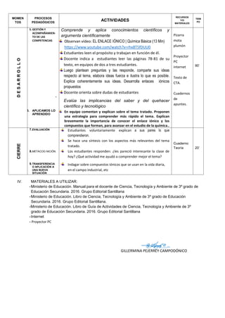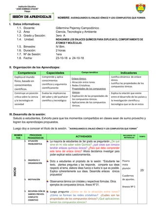 Este documento presenta el plan de una sesión de aprendizaje sobre enlaces iónicos y compuestos iónicos para estudiantes de 3er grado. La sesión incluye actividades como observar ejemplos de compuestos iónicos, ver un video explicativo, leer el texto y trabajar en equipos para responder preguntas y explicar conceptos clave. El objetivo es que los estudiantes comprendan la atracción entre iones, la formación de redes cristalinas y las propiedades y aplicaciones de los compuestos iónicos.