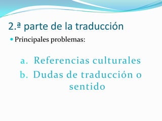 Este documento describe los principales retos de traducir un texto que contiene referencias culturales estadounidenses como expresiones idiomáticas, poemas, deportes y nombres propios. Explica que algunas palabras como "consejero académico" o "canario en la mina de carbón" requieren notas al pie para conservar su significado. También recomienda generalizar términos de béisbol como "rosin bag" o traducir frases como "bebe más despacio" en lugar de "chug a lug".