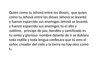 Este documento alaba a Dios como el único y verdadero Dios, que se levanta sobre todos los enemigos. Cuando las personas pasan por dificultades, el Espíritu Santo las guía y sostiene para que no declinen. El documento también expresa gratitud hacia Jesucristo por salvar a los pecadores y prometer estar con ellos hasta el fin, además de preparar un hogar celestial para los creyentes.