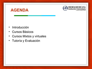 Este documento presenta la agenda de una reunión de seguimiento al apoyo virtual de la jefatura de educación virtual. La agenda incluye una introducción sobre escenarios de innovación educativa apoyados con TIC y alfabetización tecnológica. También cubre cursos básicos, cursos mixtos y virtuales, tutoría, y evaluación, con detalles sobre procedimientos y entregables para cada tema. Finalmente, presenta indicadores para evaluar aspectos generales, respeto a compañeros, orden, cumplimiento de plazos, y cu