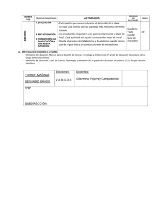 Este documento presenta la planificación de una sesión educativa de 3 horas sobre nutrición celular para estudiantes de 2do grado. La sesión incluye actividades como ver videos, leer textos, completar anexos y elaborar infografías para explicar los procesos de nutrición celular como la fotosíntesis, el catabolismo y el anabolismo. El objetivo es que los estudiantes comprendan y apliquen conocimientos científicos sobre el metabolismo a nivel celular.