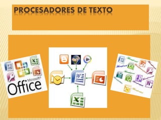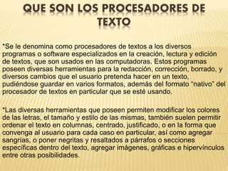 Este documento describe los procesadores de texto como programas de software especializados en la creación, edición y lectura de textos. Estos programas permiten modificar formatos de texto, agregar imágenes e hipervínculos, y guardar documentos en diferentes formatos. Algunos de los procesadores de texto más conocidos son Microsoft Word, OpenOffice Writer, y alternativas de código abierto como AbiWord o suites en línea como Google Docs.