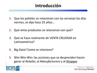 Este documento describe cómo el análisis de grandes cantidades de datos de ventas (15 millones de tickets por mes con 200 millones de productos vendidos) puede utilizarse para realizar ventas cruzadas exitosas. Se presenta un caso sobre bebidas energizantes que muestra que el 41% de las ventas ocurren por la noche los viernes y sábados, y que los compradores de energizantes también tienden a comprar licores frutados, bebidas de alta graduación y frizantes. Este análisis llevó a cambios publicitarios y acc