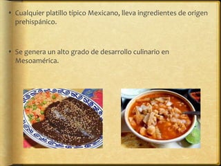 El documento describe la culinaria prehispánica de México. Los pueblos mesoamericanos desarrollaron una sofisticada gastronomía utilizando ingredientes nativos como el maíz. Los banquetes del emperador Moctezuma incluían más de 200 platillos elaborados con tortillas, tamales, salsas, carnes y frutas. Los mexicas tenían dioses asociados con el maíz y rituales agrícolas para honrarlos durante el cultivo y la cosecha.