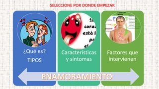 El enamoramiento es un estado emocional caracterizado por alegría y fuerte atracción hacia otra persona, influenciado por factores biológicos y bioquímicos. Incluye síntomas como deseo de contacto físico, temor al rechazo y falta de concentración, y se distingue del amor verdadero según Erich Fromm, quien sugiere que el amor surge una vez que el enamoramiento se desvanece. La conexión emocional implica compartir pensamientos y sentimientos profundos, generando una fuerte atracción tanto física como personal.