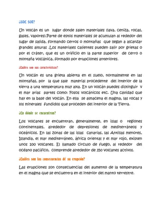 El documento habla sobre los volcanes. Explica que un volcán es un lugar por donde salen materiales calientes como lava, cenizas y rocas desde el interior de la Tierra. Los volcanes se encuentran generalmente en islas o regiones alrededor de depresiones oceánicas o mediterráneas. Las erupciones volcánicas son consecuencia del aumento de la temperatura del magma bajo la superficie terrestre.