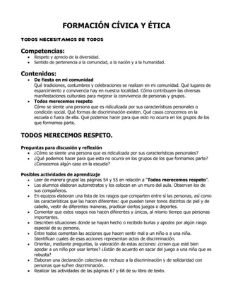 Este documento presenta el plan de estudios bimestral para el segundo grado. Incluye proyectos, temas y actividades para las asignaturas de Español, Formación Cívica y Ética, Matemáticas y Exploración de la Naturaleza y la Sociedad, con un enfoque en reseñar cuentos, respeto a la diversidad, problemas multiplicativos y costumbres locales.