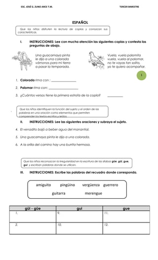 Este documento presenta varias actividades educativas para estudiantes de primaria en diferentes materias como español, matemáticas, exploración de la naturaleza y la sociedad y formación cívica y ética. Incluye instrucciones, preguntas, poemas, canciones y problemas para que los estudiantes practiquen y demuestren su comprensión en estas áreas.