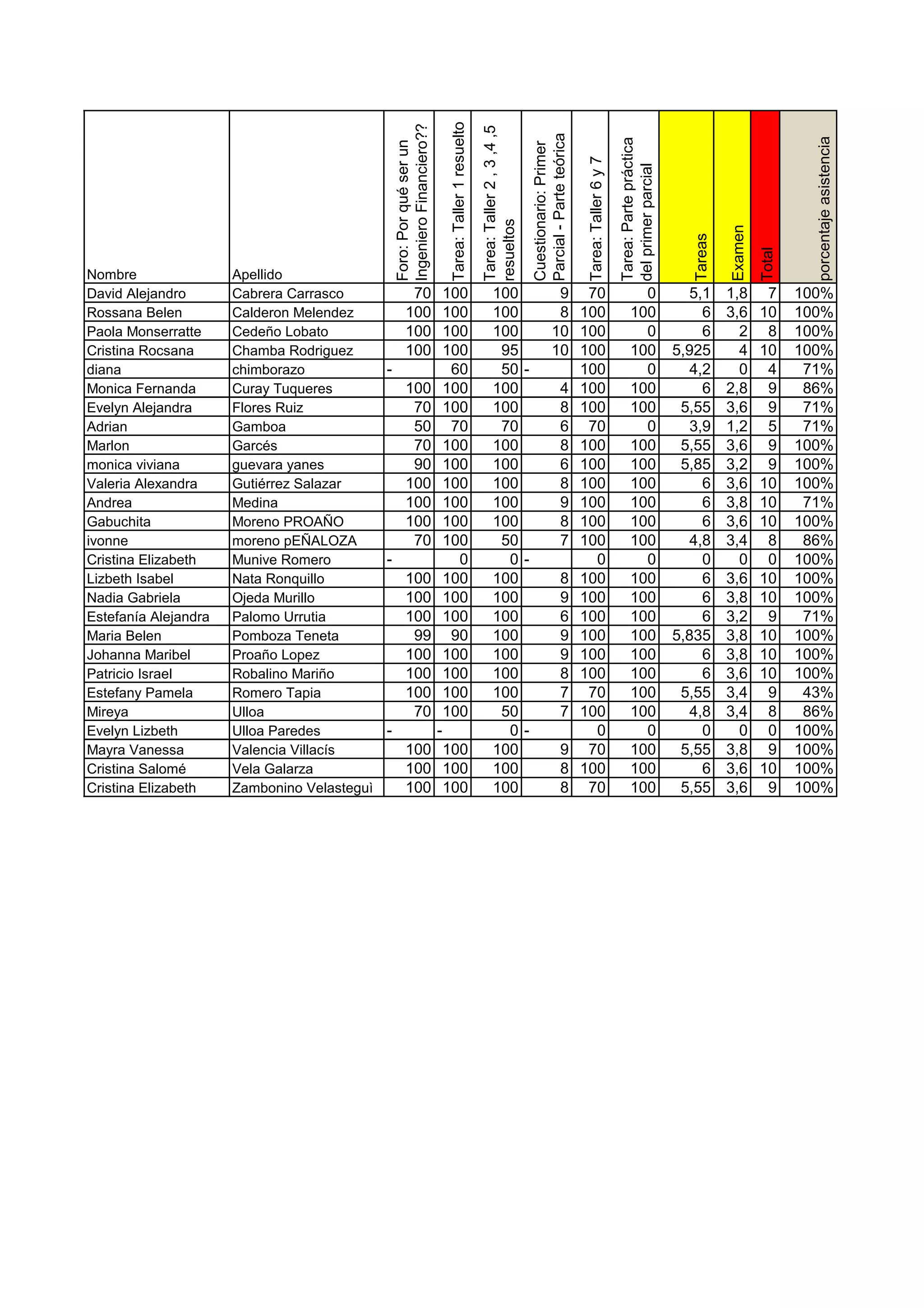 Este documento presenta los resultados de varias tareas, foros de discusión, cuestionarios y exámenes parciales de un curso para varios estudiantes. Incluye las calificaciones de cada estudiante en cada actividad y tarea, así como su porcentaje de asistencia al curso.