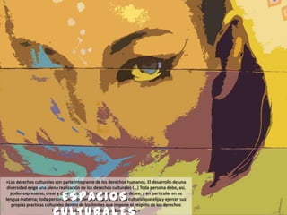 El documento habla sobre la importancia de los derechos culturales y la necesidad de abrir espacios para la generación y difusión de la cultura. Propone explorar el arte callejero/graffiti y la expresión arquitectónica para rehabilitar espacios culturales existentes y convertirlos en lugares recreativos accesibles para la comunidad. Como ejemplo, describe brevemente un proyecto para rehabilitar la antigua tenencia de carabineros de Carlos Trupp y convertirla en un centro cultural.