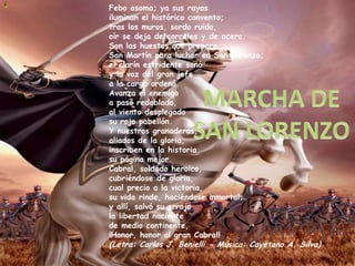 El poema describe la batalla de San Lorenzo entre las fuerzas de San Martín y el enemigo. Se menciona que al amanecer se oye ruido de caballos y acero detrás de los muros de un convento histórico, donde San Martín prepara a sus tropas para luchar. En la batalla, el enemigo avanza con su bandera roja desplegada mientras que los granaderos argentinos escriben la mejor página en la historia defendiendo la libertad del continente y rindiendo su vida en pos de la victoria, como el