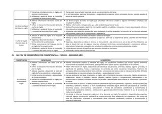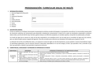 La programación curricular anual de inglés I se fundamenta en un enfoque comunicativo, fomentando competencias en comprensión y producción de textos orales y escritos a través de prácticas sociales del lenguaje. Se subraya la importancia de las TIC para lograr un aprendizaje significativo y se establecen competencias y estándares de aprendizaje detallados, además de enfoques transversales para el desarrollo integral de los estudiantes. Los enfoques incluyen derechos, inclusión, igualdad de género y educación ambiental, promoviendo un ambiente de respeto y equidad en el aprendizaje.
