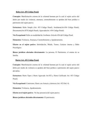 Este documento resume los conceptos y elementos de varios delitos como robo, hurto, secuestro, extorsión, así como tentativa y frustración. También cubre leyes especiales sobre robo de vehículos automotores e intimidación pública. En 3 oraciones o menos, el documento analiza las definiciones legales, elementos y agravantes de estos delitos según el código penal venezolano.