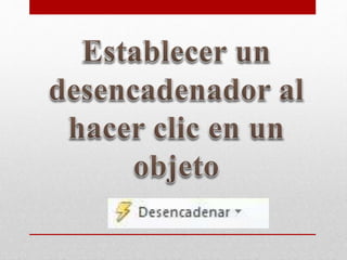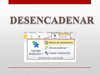 Este documento proporciona instrucciones sobre cómo agregar hipervínculos, botones de acción y desencadenadores a una presentación de PowerPoint. Explica los pasos para vincular texto u objetos a otras diapositivas o páginas web, y cómo configurar botones para realizar acciones como reproducir sonido. También describe cómo aplicar efectos de animación a objetos para que se desencadenen al hacer clic.