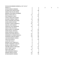 Este documento presenta las calificaciones de los estudiantes del Grupo 2° E de la Escuela Secundaria Diurna No. 135 "U.R.S.S.", incluyendo sus nombres, calificaciones numéricas y porcentajes de aprobación. Se enumeran los nombres de 32 estudiantes junto con sus calificaciones.