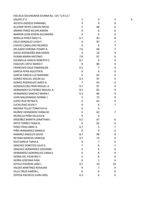 Este documento presenta las calificaciones de los estudiantes del Grupo 2° E de la Escuela Secundaria Diurna No. 135 "U.R.S.S.". Se lista el nombre completo de cada estudiante junto con sus calificaciones numéricas en una escala del 0 al 10. Hay un total de 42 estudiantes en la lista con sus respectivas calificaciones.