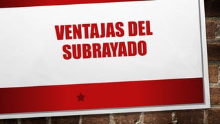 Este documento ofrece información sobre la técnica de estudio del subrayado. Explica que el subrayado permite destacar las ideas principales y secundarias de un texto para facilitar la elaboración de esquemas y resúmenes. Además, describe diferentes métodos de subrayado como el lineal, estructural y de señalización personalizada, y ofrece consejos sobre cómo aplicar esta técnica de manera efectiva.