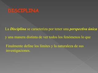 La enfermería es una disciplina caracterizada por tener una perspectiva única centrada en el cuidado, un cuerpo de conocimientos propio y una forma distinta de ver los fenómenos relacionados con la salud. Para consolidarse como disciplina, la enfermería debe seguir fortaleciendo sus teorías y conocimientos para mejorar la práctica y satisfacer las necesidades de salud de la población de manera eficaz e interdisciplinaria.