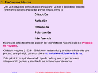 Este documento resume los principales fenómenos ondulatorios como la difracción, reflexión, refracción y polarización. Explica el principio de Huygens para la interpretación de estos fenómenos. También describe los fenómenos de interferencia que ocurren cuando dos ondas se superponen, incluyendo las ondas estacionarias resultantes de la interferencia de ondas que se propagan en sentidos opuestos.