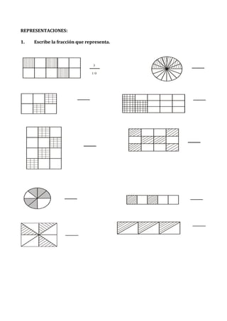 Este documento presenta información sobre fracciones, incluyendo cómo leer y representar fracciones, así como ejemplos de problemas para practicar el conocimiento de fracciones. Se define el numerador y el denominador, y cómo dividir una unidad en partes iguales. Se proporcionan ejemplos de representar, leer y completar fracciones.