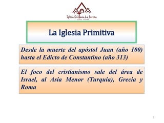 El documento resume la Iglesia Primitiva desde la muerte del apóstol Juan hasta el Edicto de Constantino. Durante este período, la iglesia sufrió persecución por parte del Imperio Romano, pero también se desarrolló su organización y luchó contra herejías como el arrianismo, defendiendo la doctrina bíblica. La iglesia se expandió a pesar de las dificultades.