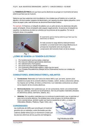Este documento introduce los conceptos básicos de la electricidad, incluyendo la estructura del átomo, las cargas eléctricas, la corriente eléctrica y su generación. Explica cómo fluye la electricidad en un circuito a través de un generador, conductor y receptor, y define las magnitudes eléctricas como la intensidad de la corriente, tensión, resistencia y potencia. También resume las leyes de Kirchhoff y Ohm que relacionan estas cantidades.