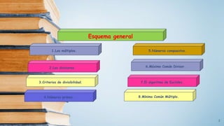 Este documento presenta conceptos básicos sobre números enteros como múltiplos, divisores, números primos y compuestos. Explica cómo calcular múltiplos y divisores de un número y describe criterios de divisibilidad. También introduce el algoritmo de la criba de Eratóstenes para encontrar números primos menores a un número dado y cómo descomponer un número compuesto en factores primos.