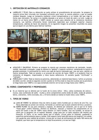 Este documento clasifica y describe los principales materiales de construcción como pétreos, cerámicos, compuestos, metálicos y aglutinantes. Explica cómo se obtienen materiales cerámicos como ladrillos, azulejos y porcelana mediante procesos de extrusión, moldeado y doble cocción. También describe la obtención de vidrio a partir de arena, caliza y sosa en un horno a alta temperatura, y los diferentes tipos de vidrio. Finalmente, resume cómo se producen el yeso, el cemento y el hormig