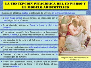 1) El documento describe diferentes modelos históricos del universo, incluyendo las concepciones pitagórica, aristotélica y ptolemaica. 2) Introduce las tres leyes de Kepler sobre el movimiento planetario y cómo Newton dedujo su ley de la gravitación universal a partir de ellas. 3) Explica cómo la conservación del momento angular en un campo gravitatorio central implica que las órbitas planetarias son curvas planas que se recorren en el mismo sentido.