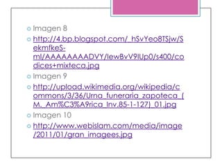 Este documento presenta información sobre diferentes culturas prehispánicas de México como Teotihuacan, los toltecas, los mexicas, los mayas, los olmecas, los mixtecas y los zapotecas. Brevemente describe los orígenes y características principales de cada una de estas culturas. También incluye una lista de integrantes y profesor para un proyecto de la administración y su origen.