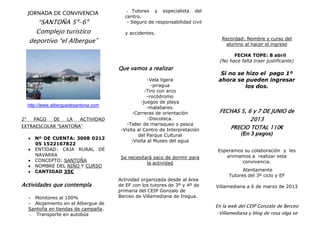 Este documento anuncia una jornada de convivencia para estudiantes de 5o y 6o grado en el complejo deportivo "El Albergue" del 5 al 7 de junio de 2013. Incluirá actividades como vela, piragüismo, tiro con arco, rocódromo, juegos de playa y más. Se necesitará saco de dormir y el pago total es de 110 euros en 3 pagos. El último pago debe realizarse antes del 8 de abril.