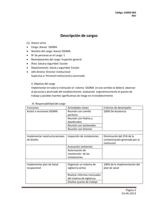 Este documento describe los cargos y responsabilidades de un Asesor SSOMA y un Director Institucional en el Instituto del Mar. También incluye procedimientos para controlar documentos e implementar comunicación interna y externa.