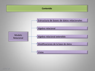 Este documento presenta los fundamentos del modelo relacional de bases de datos, incluyendo conceptos como el álgebra relacional, operaciones como selección, proyección, unión, diferencia de conjunto, producto cartesiano y renombre, así como ejemplos de su aplicación sobre tablas de estudiantes e inscripciones a asignaturas.