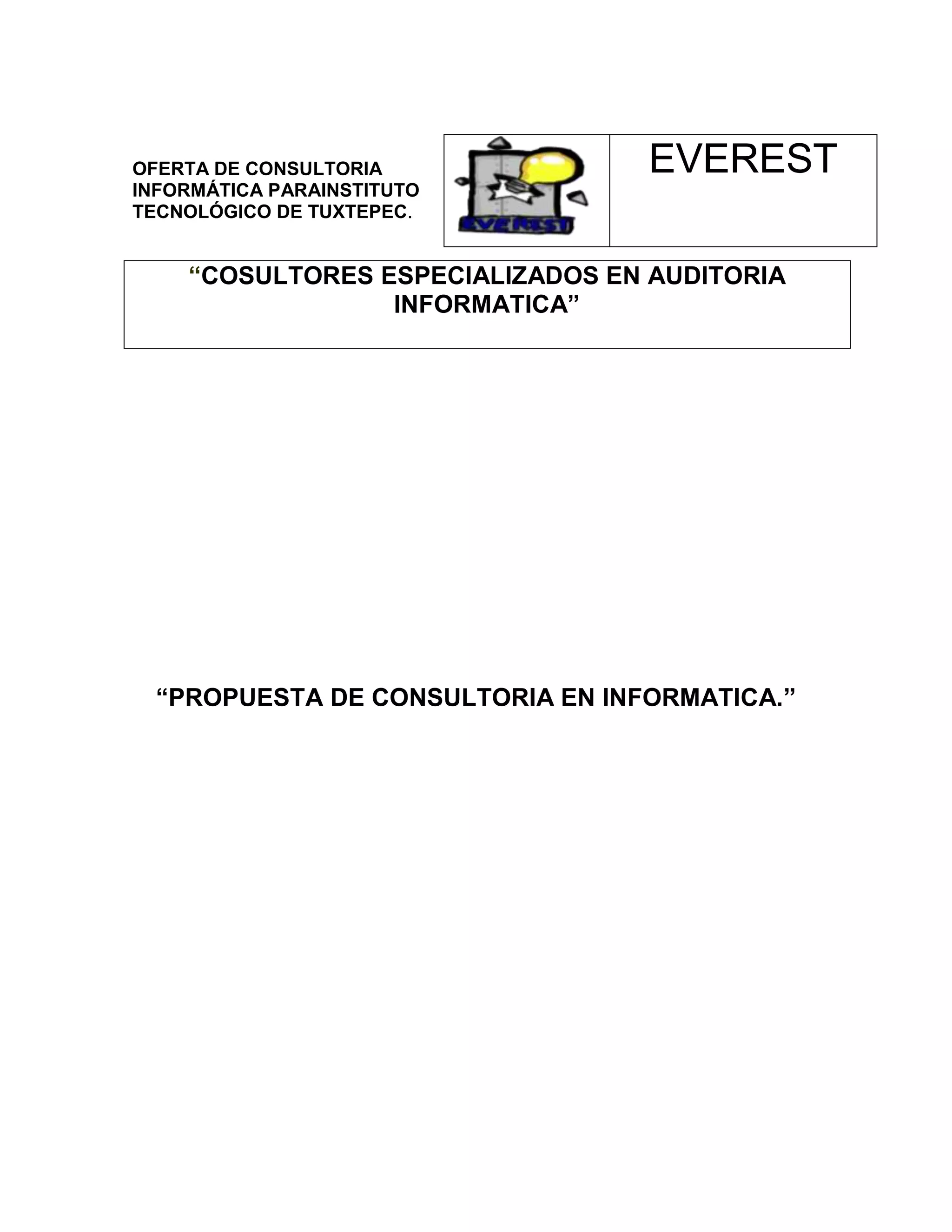 Este documento presenta una propuesta de consultoría informática de la empresa Everest para realizar una auditoría en los laboratorios del Instituto Tecnológico de Tuxtepec. La propuesta incluye una descripción de los objetivos y alcances de la auditoría, la metodología a seguir, los informes que se generarán, el cronograma tentativo, los consultores involucrados y el presupuesto.