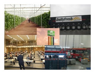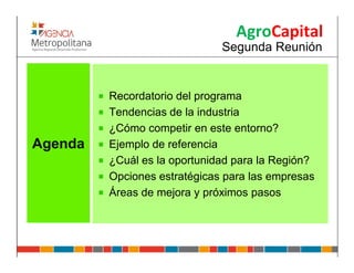 La reunión discute cómo las empresas pueden mejorar su competitividad en el entorno actual. Se presentan las tendencias de la industria como el aumento del PIB y la esperanza de vida, la urbanización y el énfasis en la conveniencia. Actualmente las empresas compiten en los negocios de "en bruto" y "larga duración", los cuales ofrecen márgenes limitados. El negocio más rentable es el de "fresco listo", que agrega más valor y permite competir por innovación en lugar de precio.