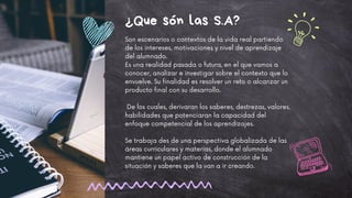 Las situaciones de aprendizaje (SA) son escenarios o contextos basados en los intereses y nivel de aprendizaje de los estudiantes. Se utilizan para resolver retos o alcanzar productos finales, desarrollando habilidades a través de un enfoque interdisciplinario. Las SA se evalúan de forma continua y formativa para potenciar los procesos de aprendizaje mediante métodos como proyectos, juegos de rol, exposiciones u otras expresiones artísticas.