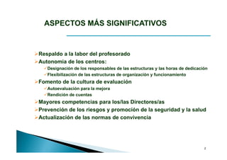 El documento establece las normas de organización y funcionamiento de las escuelas infantiles de segundo ciclo, colegios de educación primaria, colegios de educación infantil y primaria y centros públicos específicos de educación especial. Regula aspectos como los derechos y deberes del alumnado y profesorado, la autonomía de los centros a través de su plan de centro, y las normas de convivencia.