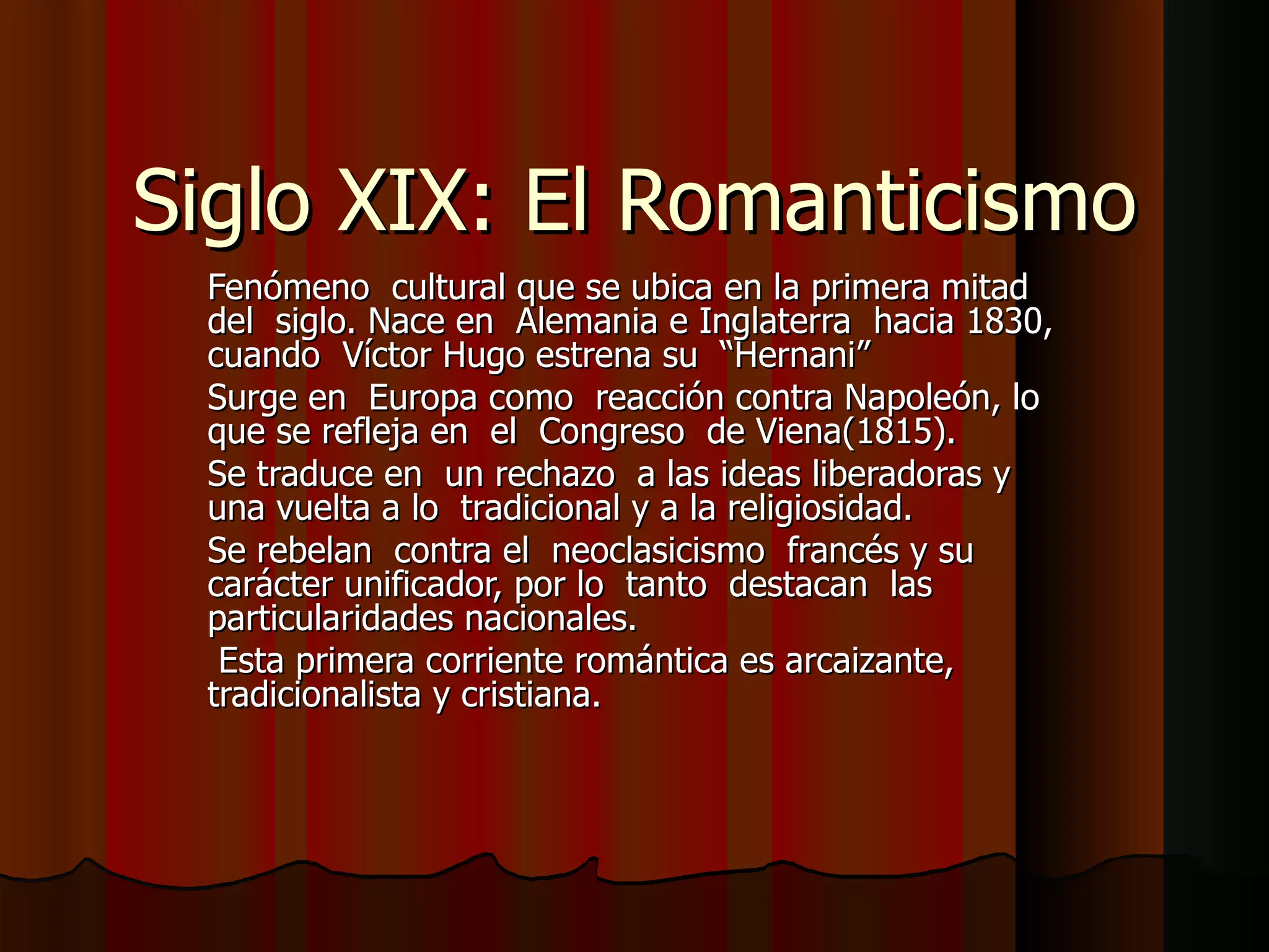 El documento describe el Romanticismo como un movimiento cultural que surgió en Europa en el siglo XIX como reacción contra las ideas del Neoclasicismo y la Revolución Francesa. Se caracterizó por enfatizar la libertad individual, los sentimientos y lo nacional. Algunos de sus temas clave fueron la naturaleza, lo medieval, lo exótico y las preocupaciones filosóficas y políticas. El Romanticismo tuvo dos polos: uno restaurador de valores tradicionales y otro más liberal y revolucionario.