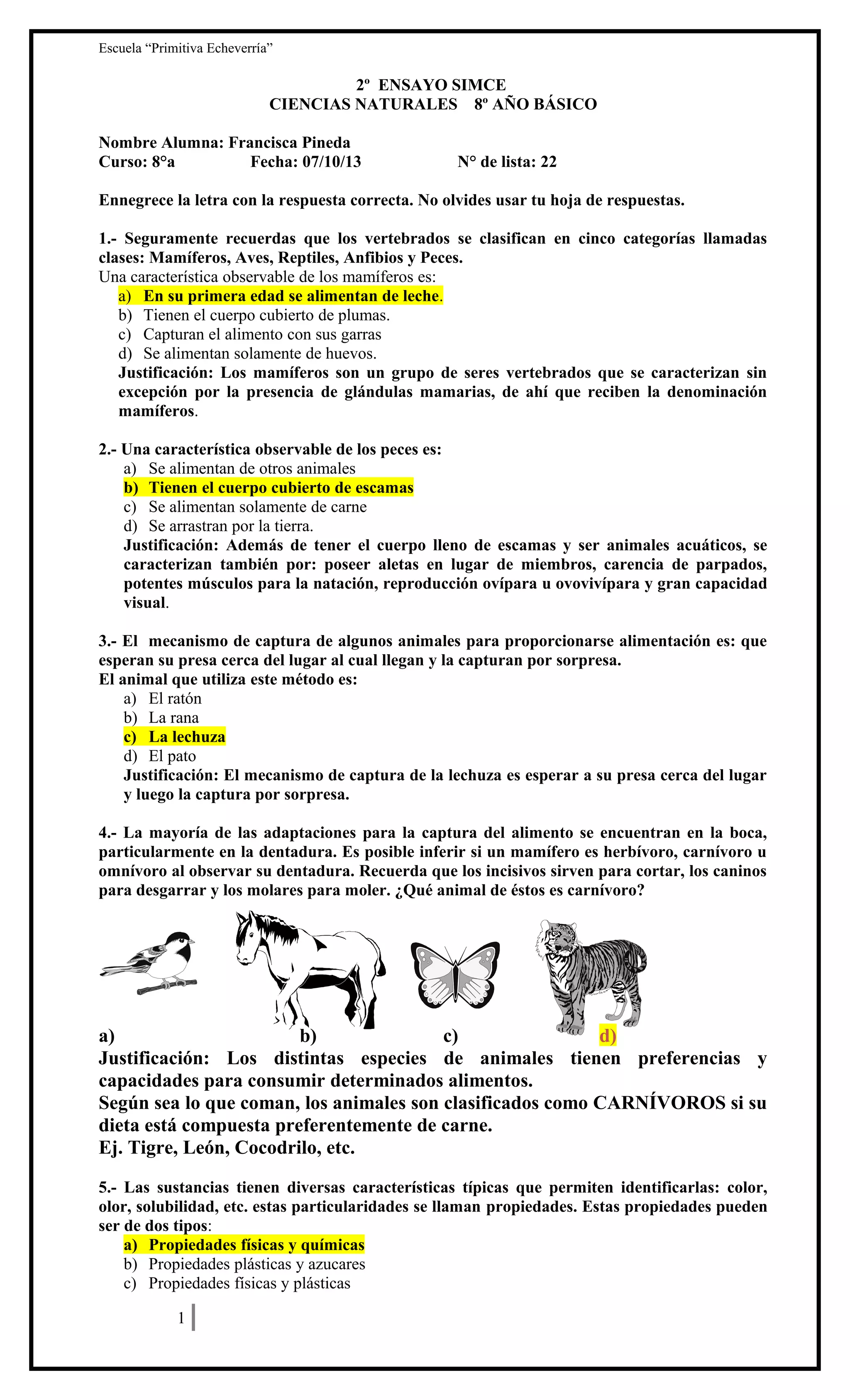 Este documento contiene las respuestas correctas de Francisca Pineda a un examen de Ciencias Naturales de 8o año básico. El examen contenía 15 preguntas sobre diversos temas de Ciencias como clasificación de animales, características de sustancias, alimentos ricos en proteínas, y factores que limitan la salud. El documento finaliza con la hoja de respuestas de Francisca donde enlista las letras de las respuestas correctas a cada pregunta.