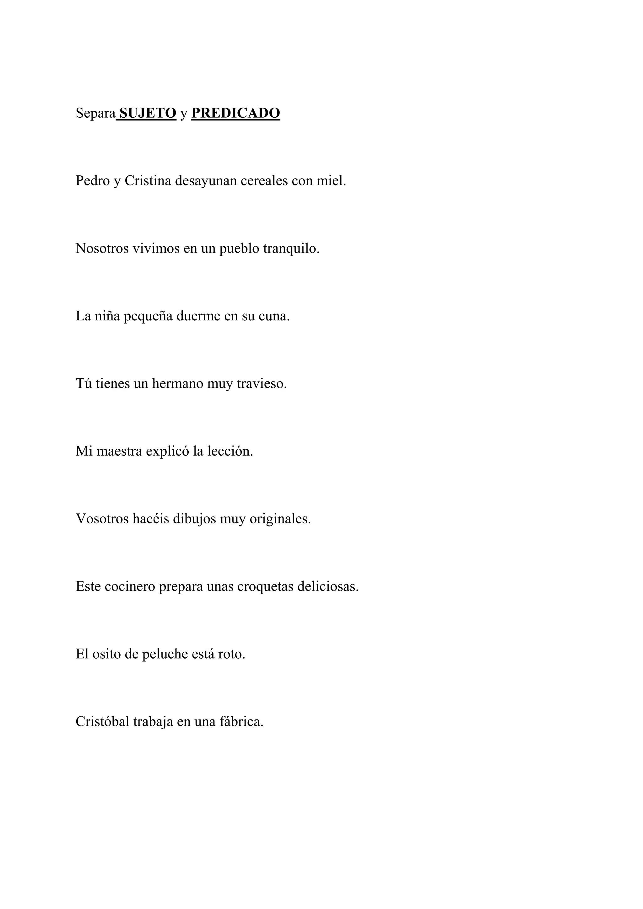 Este documento presenta varios ejercicios para separar el sujeto y el predicado en oraciones. Se pide identificar el sujeto y predicado en 20 oraciones diferentes, ampliar el sujeto o predicado en algunas oraciones, y completar oraciones incompletas con el sujeto o predicado adecuado. El objetivo es practicar la identificación de sujeto y predicado como parte fundamental de la gramática.