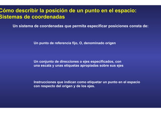 Este documento describe diferentes sistemas de coordenadas y conceptos vectoriales básicos. Explica cómo los sistemas de coordenadas cartesiano y polar permiten especificar la posición de un punto en el espacio. También define magnitudes escalares y vectoriales, y describe las operaciones básicas de álgebra vectorial como la adición, sustracción y multiplicación de vectores.