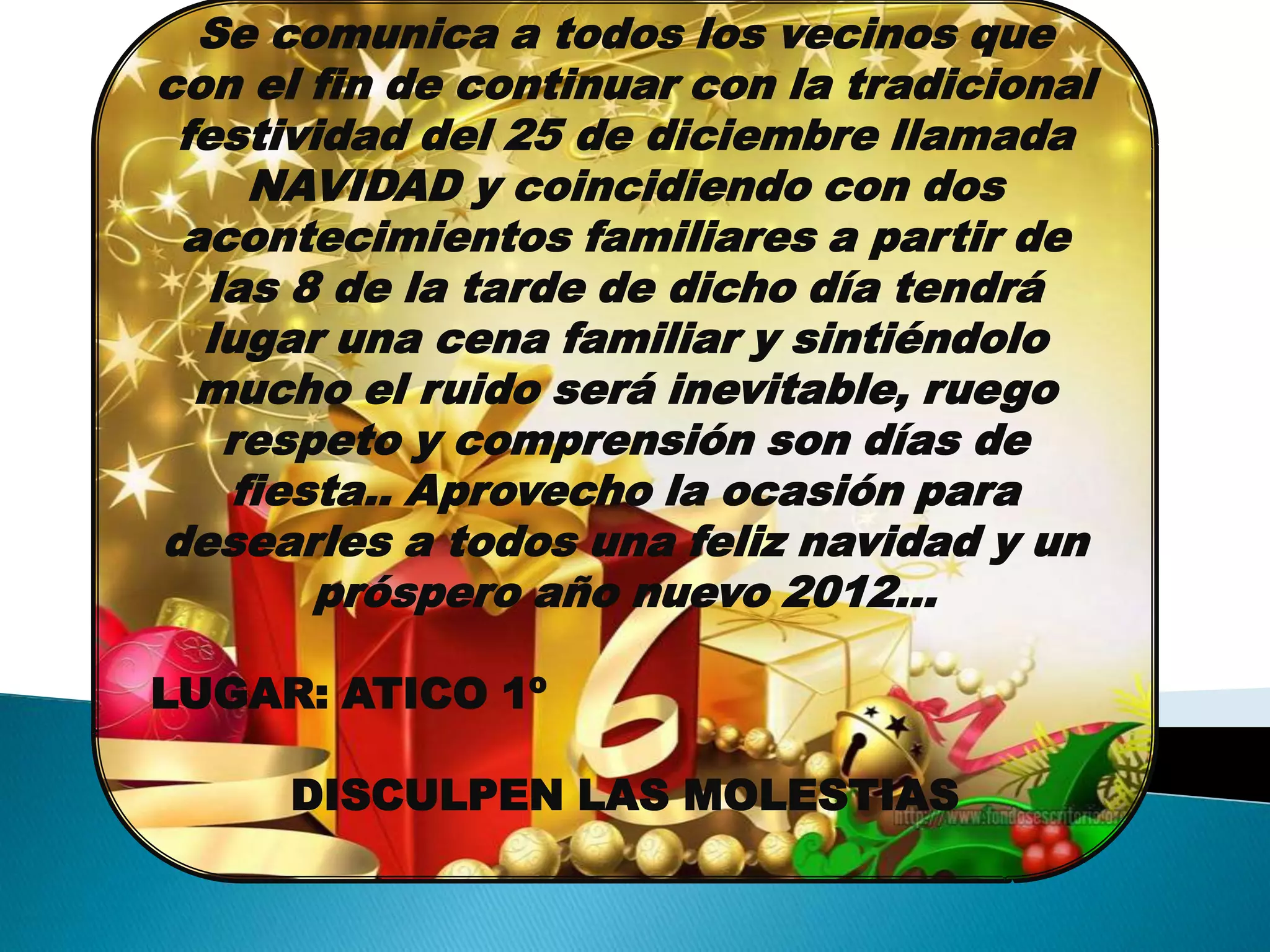 La nota avisa a los vecinos que habrá una cena familiar en Navidad en el ático a partir de las 8 pm, lo que causará ruido inevitable debido a las celebraciones y eventos familiares coincidentes; pide respeto y comprensión durante los días festivos y desea a todos una feliz Navidad y próspero Año Nuevo.