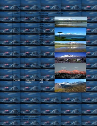 Este documento describe la estructura y actividad de los volcanes. Explica que un volcán es una grieta a través de la cual emerge magma desde el interior de la Tierra. Detalla las partes principales de un volcán, incluido el cono volcánico, la chimenea, el cráter y la cámara magmática. Además, proporciona información sobre algunos volcanes específicos en Chile y sus registros de erupciones.