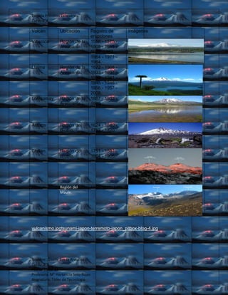 El documento describe la estructura y actividad de los volcanes. Explica que un volcán es una grieta a través de la cual emerge el magma desde el interior de la Tierra. Detalla las partes principales de un volcán, incluyendo el cono volcánico, la chimenea, el cráter y la cámara magmática. Además, señala que la actividad volcánica es más común en zonas donde convergen placas tectónicas y proporciona ejemplos de volcanes activos en Chile.