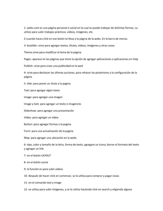 Este documento proporciona instrucciones sobre cómo usar una página web personal llamada webs.com. Explica que webs.com permite subir trabajos, videos e imágenes y describe las funciones de los botones Builder, Theme, Pages y Publish. También explica cómo agregar texto, imágenes, presentaciones de diapositivas, videos, botones y formularios a la página y cómo modificar el formato del texto y agregar enlaces e imágenes.
