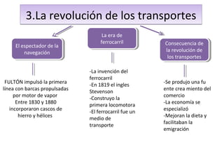 La revolución de los transportes en el siglo XIX, especialmente el ferrocarril, impulsó un fuerte crecimiento del comercio y la especialización económica. La invención del ferrocarril por Stevenson en 1819 y su desarrollo posterior entre 1830 y 1880 transformó el transporte y facilitó la emigración. Esto tuvo consecuencias como la mejora de la dieta de la población.