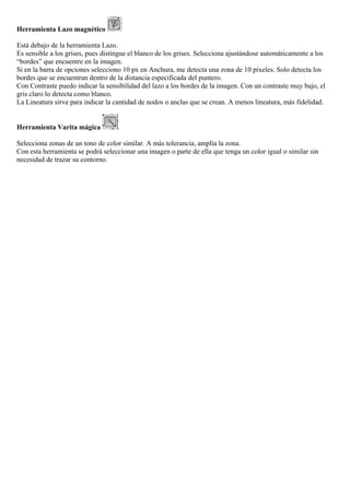 Este documento describe las diferentes herramientas de selección en Photoshop, incluyendo la herramienta Lazo para seleccionar áreas de forma libre, la herramienta Lazo poligonal para selecciones de forma angular, la herramienta Lazo magnético que se ajusta automáticamente a los bordes, y la herramienta Varita mágica para seleccionar áreas de color similar. También explica cómo usar la herramienta Tamaño de lienzo para ampliar o reducir el tamaño del lienzo de la imagen.