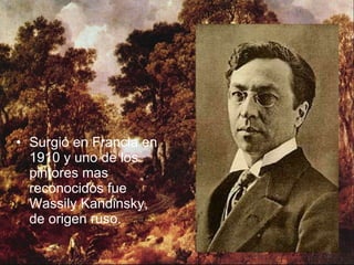 El documento describe los principales movimientos artísticos de principios del siglo XX como el abstraccionismo, el futurismo, el expresionismo alemán, el grupo Der Blaue Reiter, el surrealismo y el dadaísmo. Algunos de los artistas más destacados mencionados son Wassily Kandinsky, los hermanos Duchamp, y Man Ray. Estos movimientos buscaban la innovación y la renovación del arte alejándose de temas realistas e impresionistas.
