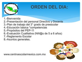 Este documento presenta la agenda de la primera reunión de padres de familia del Centro Escolar México. La reunión cubrirá la presentación del personal, el plan de estudios del tercer grado de preescolar, las competencias básicas, los propósitos del programa educativo, y el reglamento escolar. Además, detalla los campos formativos y áreas de desarrollo en la educación preescolar, incluyendo el lenguaje, pensamiento matemático, mundo natural, desarrollo físico, personal y social, y expresión